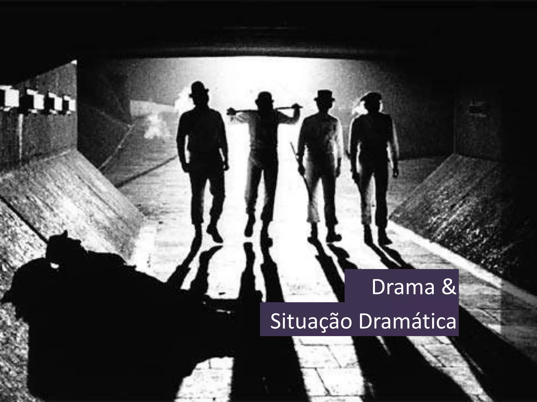 O documento discute os conceitos de drama, situação dramática, diálogo e progressão. Drama é definido como uma obra dialogada onde os personagens interagem sem um narrador. Uma situação dramática é apresentada como uma relação tensa que leva um personagem a agir, criando um conflito. O diálogo mostra a evolução do drama ao apresentar a motivação dos personagens. Para chegar a um fim, o drama requer uma progressão onde cada ação anterior cria a próxima.
