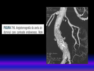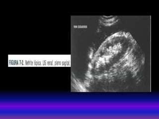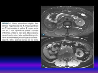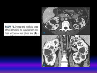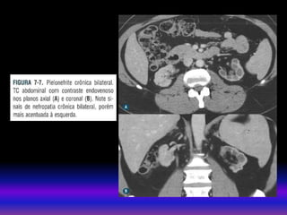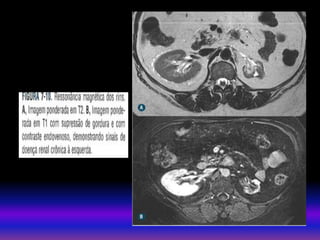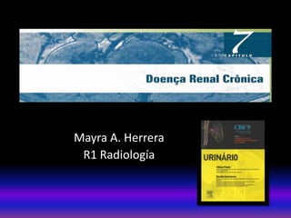O documento aborda a definição e prevalência da doença renal crônica (DRC) no Brasil, bem como métodos de imagem utilizados para diagnóstico e avaliação, incluindo RX, US, TAC, RNM e biópsia renal. Destaca a importância de protocolos com baixo contraste para pacientes em estágios avançados de DRC e o uso de gadolínio com precauções. Além disso, menciona a cintilografia renal com DMSA para avaliar a função e a perfusão renal.
