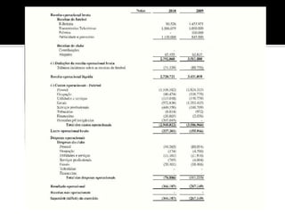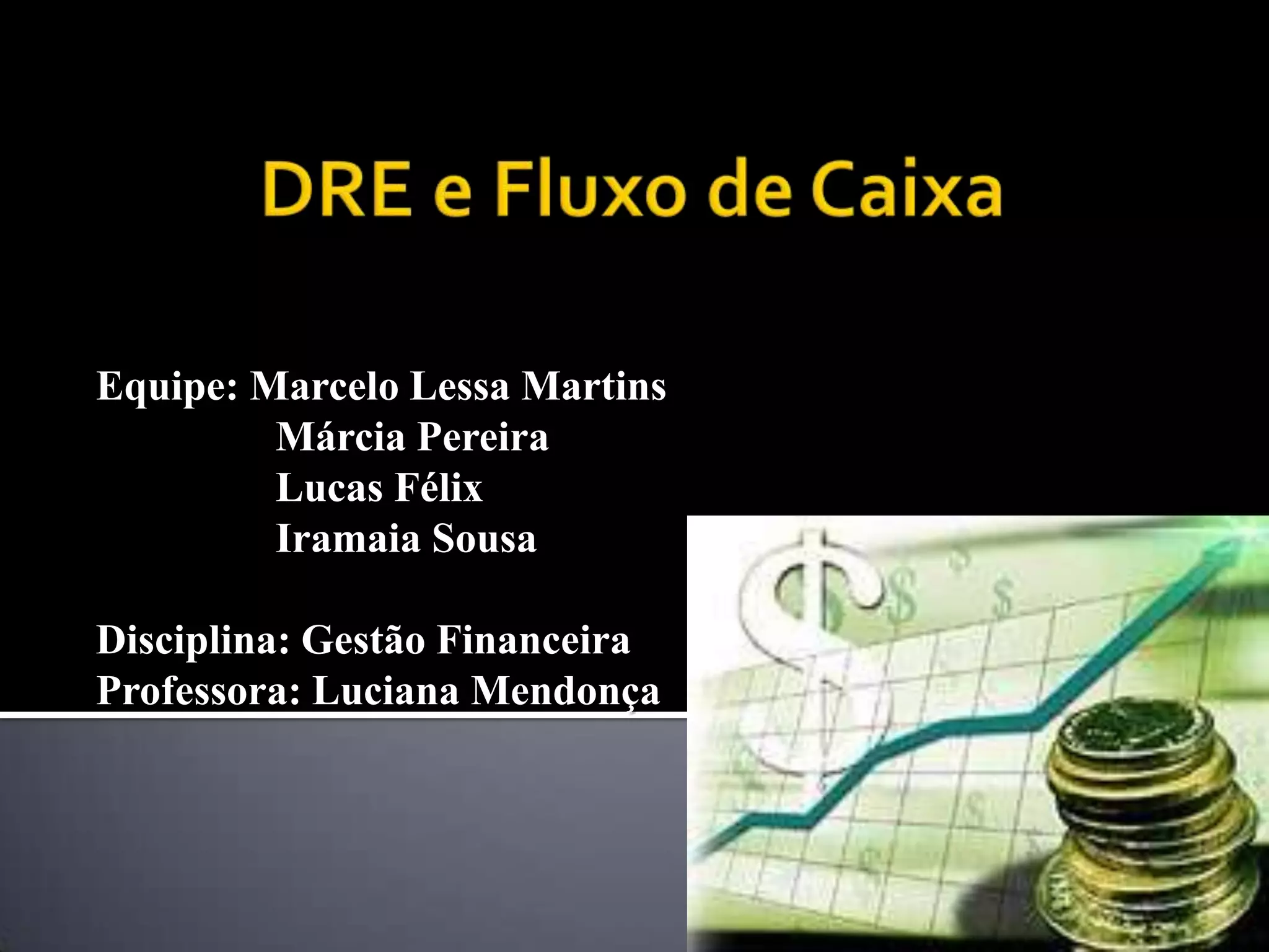 O documento discute DRE (Demonstrativo do Resultado do Exercício) e Fluxo de Caixa, definindo cada um e destacando que o DRE inclui depreciações e amortizações enquanto o Fluxo de Caixa considera apenas entradas e saídas de caixa. Ele também fornece exercícios resolvidos de DRE e Fluxo de Caixa para um time de futebol.