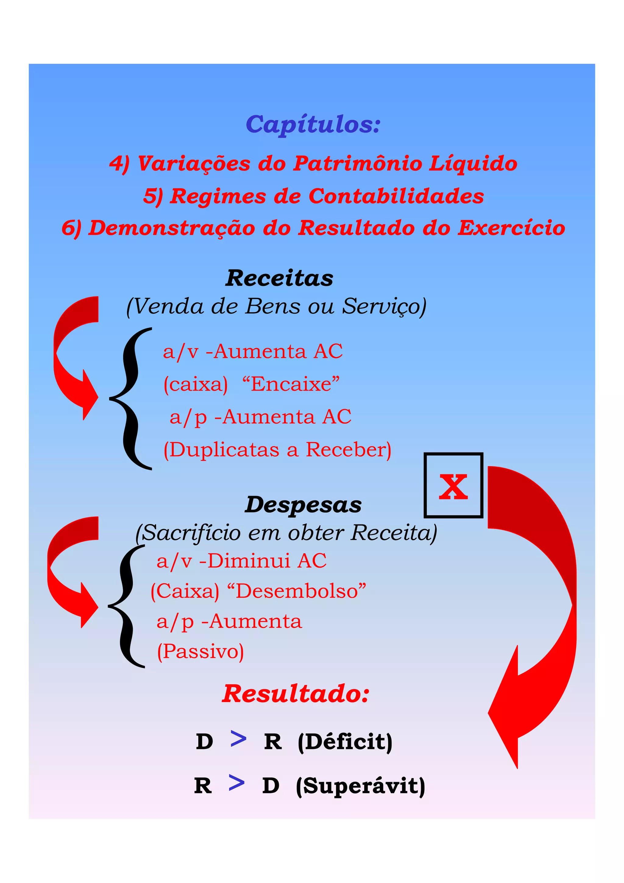 O documento discute conceitos contábeis como regimes de contabilidade, demonstração do resultado do exercício e reconhecimento de receita. Ele explica que há dois regimes para reconhecer receita e despesa - regime caixa, que considera fluxos de caixa, e regime de competência, que considera quando a receita é gerada e a despesa incorrida. Ele também fornece um exemplo de demonstração de resultado.
