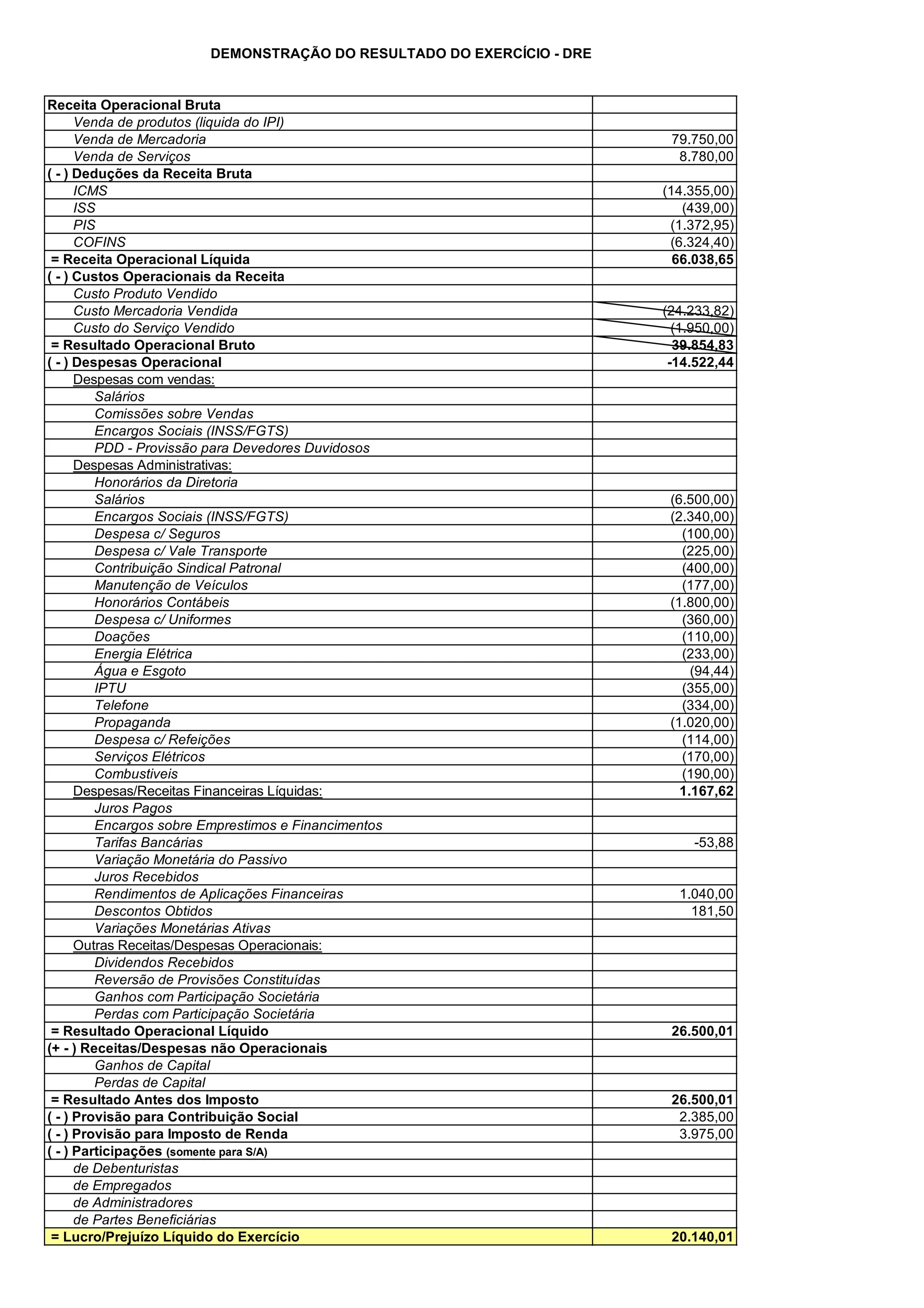 O documento apresenta o Demonstrativo do Resultado do Exercício (DRE) de uma empresa, com as receitas, custos, despesas e resultados operacionais, não operacionais e líquidos. A receita líquida foi de R$66.038,65, o resultado operacional bruto foi de R$39.854,83 e o lucro líquido do exercício foi de R$20.140,01 após provisionamentos.