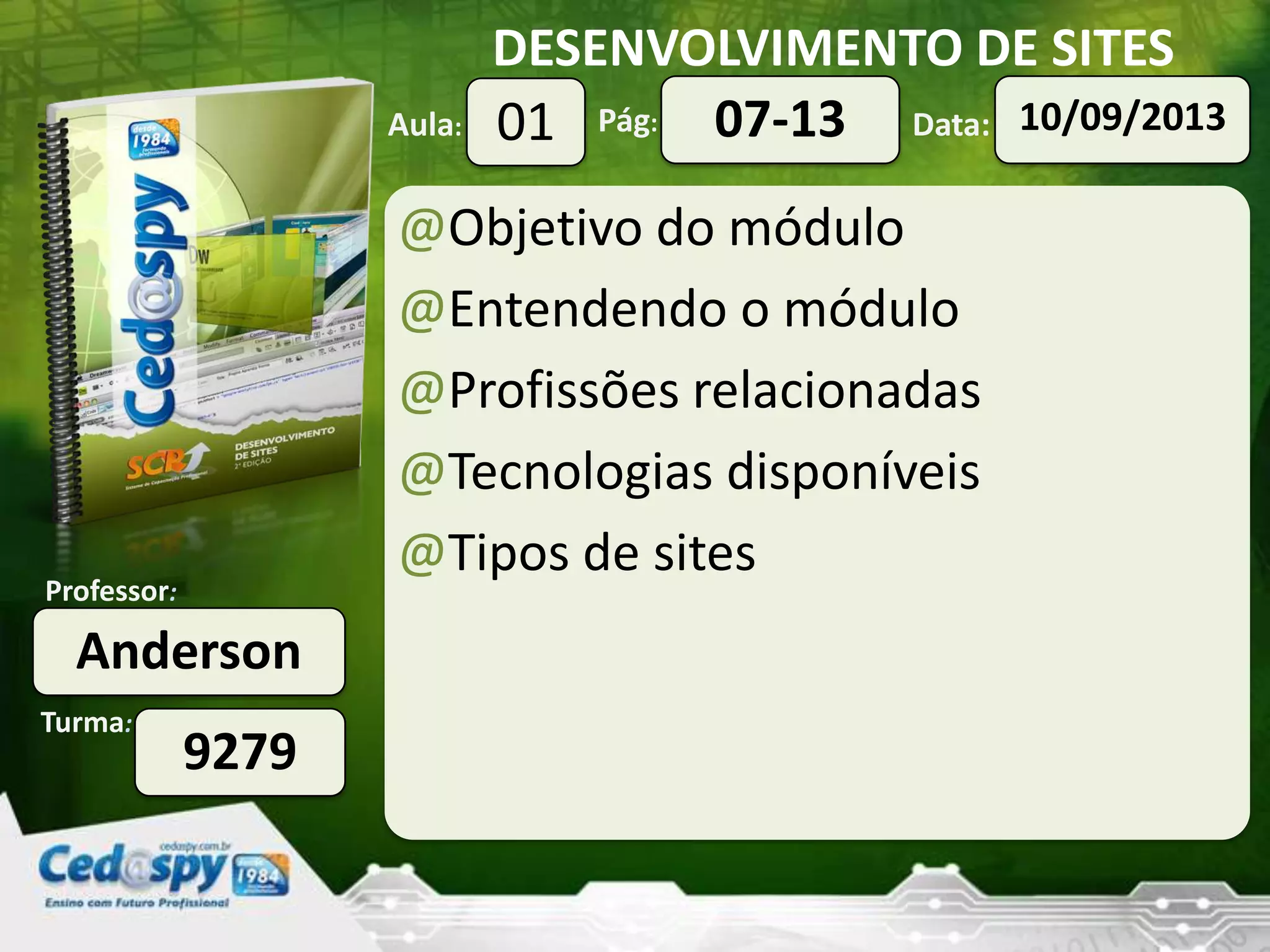 Este documento discute o desenvolvimento de sites, incluindo objetivos, profissões relacionadas, tecnologias disponíveis e tipos de sites. O documento também fornece detalhes sobre um módulo de desenvolvimento de sites, incluindo ferramentas como Adobe Dreamweaver e requisitos do projeto final.
