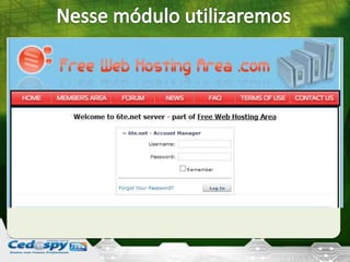 O documento discute os principais tópicos sobre desenvolvimento de sites, incluindo domínios, hospedagem, registro de domínios e escolha de provedor. Explica a importância de escolher um domínio criativo e fácil de memorizar, compatível com o público-alvo. Detalha o processo de registro de domínios no Brasil e internacionalmente, além dos requisitos e provedores de hospedagem.