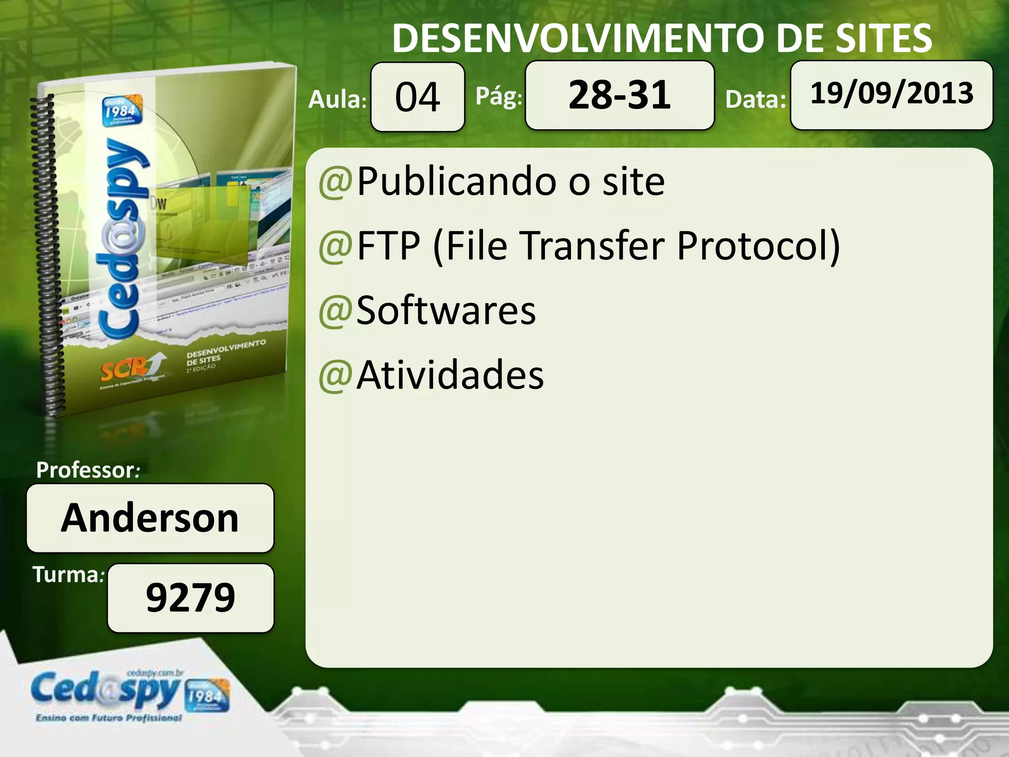 Este documento fornece instruções sobre como publicar um site na internet usando FTP (File Transfer Protocol). Ele explica o que é FTP, quais softwares podem ser usados como o FileZilla, e os passos para configurar o FTP no Dreamweaver e fazer upload e download de arquivos para o servidor web.