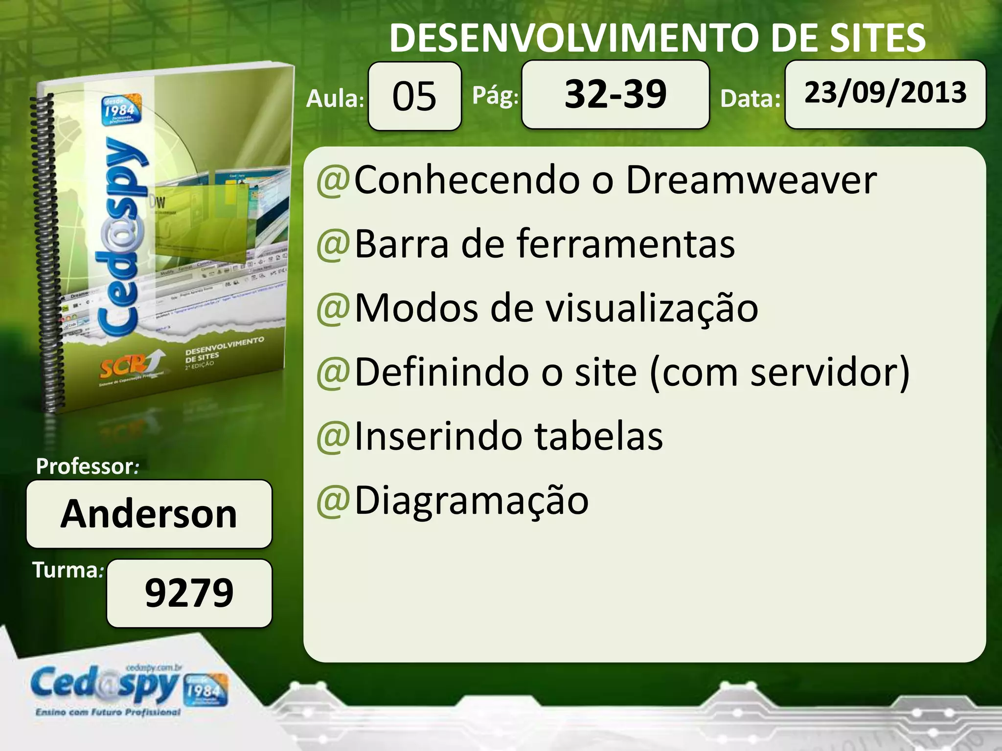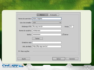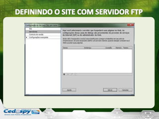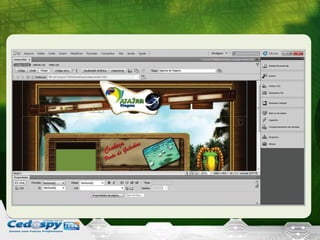 O documento discute o programa Dreamweaver e como criar um site sobre o Brasil com 4 páginas usando esse programa. Ele lista ferramentas como a barra de ferramentas do Dreamweaver, modos de visualização e como definir o site, inserir tabelas e diagramar o layout. Há também dicas sobre criar uma diagramação arrojada e interessante.