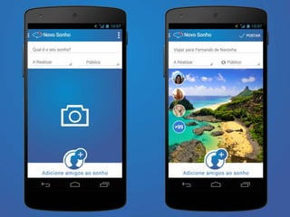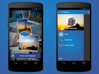 O documento descreve o lançamento do aplicativo 'Dreams', disponível para iOS, Android e Windows Phone, permitindo que usuários compartilhem e realizem sonhos de consumo e experiências. Oferece privacidade nos sonhos e recursos de interação, como posting de status e fotos, além de um modelo de negócios que envolve empresas sugerindo produtos. O desenvolvimento foi realizado por uma equipe específica, com detalhes sobre os responsáveis e investidores.
