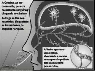 O documento discute os riscos da dependência de cocaína. Explica que a cocaína produz dependência quando usada por longos períodos, levando o usuário a precisar de doses maiores para obter o mesmo efeito e a se afastar de amigos e família para manter o vício. Também destaca a importância de campanhas de conscientização para prevenir o uso de drogas, especialmente entre os jovens.