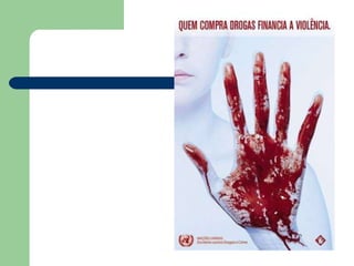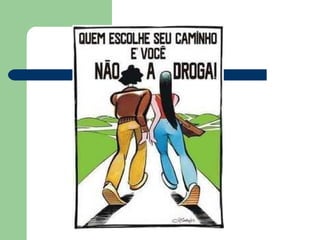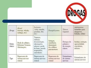 O documento discute os diferentes tipos de drogas, seus efeitos no corpo e cérebro, e os riscos do uso e dependência. Ele descreve categorias de drogas como depressores, estimulantes e perturbadores, e detalha especificamente os efeitos do álcool, crack, solventes, cocaína, maconha no organismo. Também alerta que a dependência química é difícil de superar e que a prevenção é a melhor estratégia.