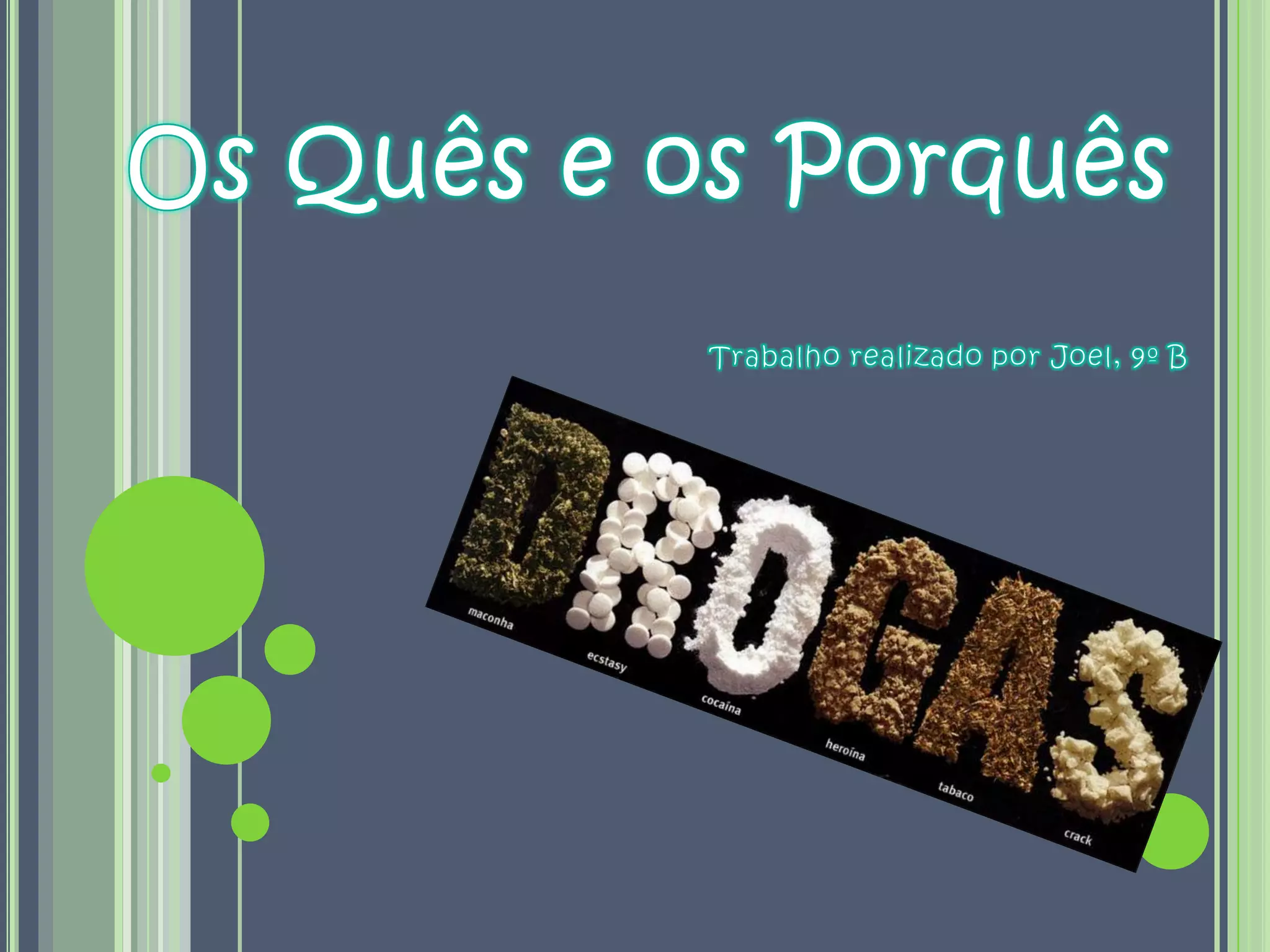 O trabalho de Joel, do 9º B, explora as drogas, suas definições, tipos (como ecstasy, cocaína e cogumelos mágicos) e os fatores que influenciam seus efeitos. O documento discute os motivos do consumo entre jovens, ressaltando os impactos negativos à saúde. Além disso, enfatiza a influência da dose, via de administração e contexto no efeito das substâncias.