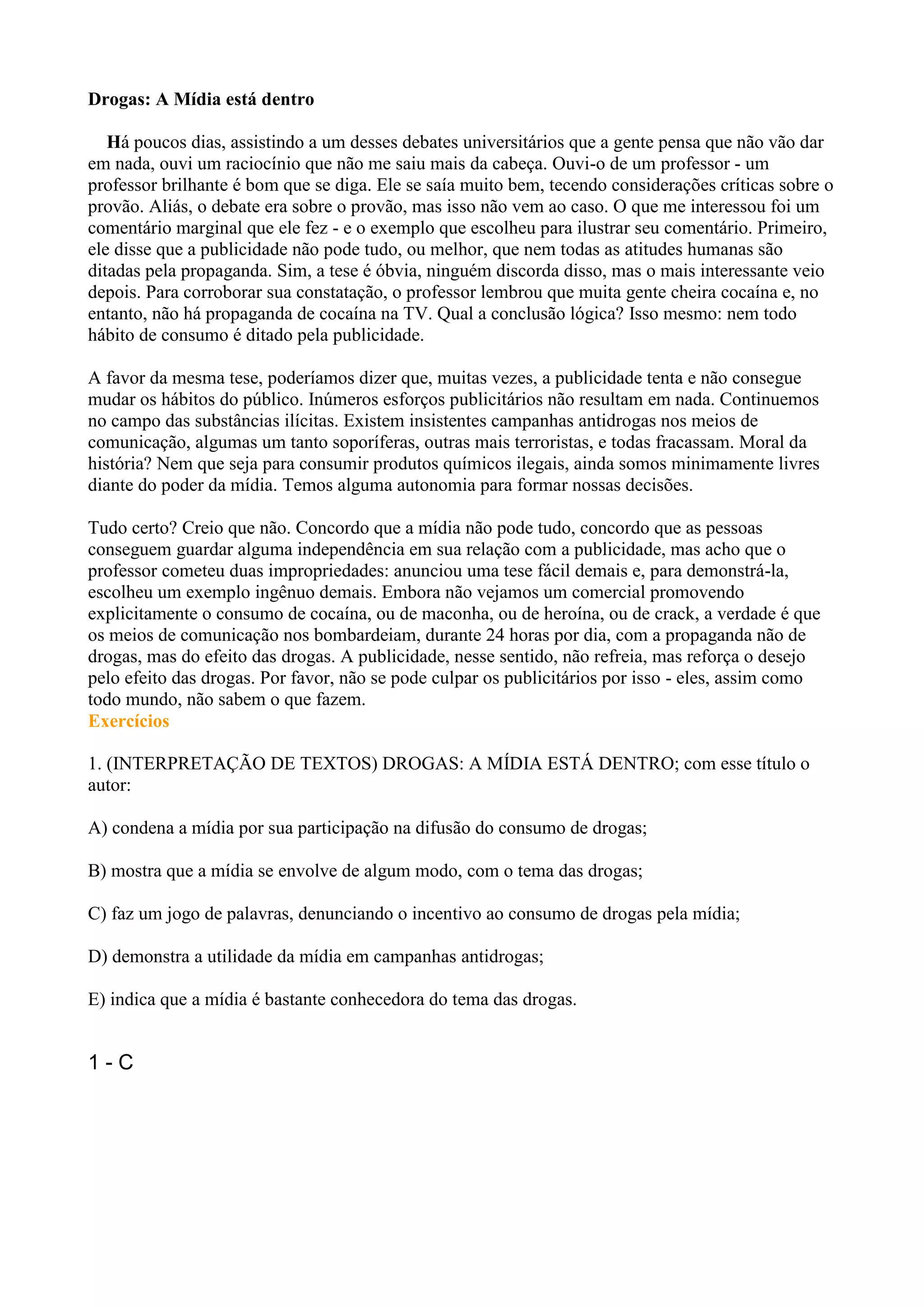 O documento discute como a mídia influencia o consumo de drogas de forma indireta, apesar de não haver propaganda explícita. Embora a mídia promova campanhas antidrogas, ela também bombardeia o público com a propaganda do efeito das drogas. A conclusão é que a mídia reforça o desejo pelos efeitos das drogas, mesmo sem promover o consumo diretamente.