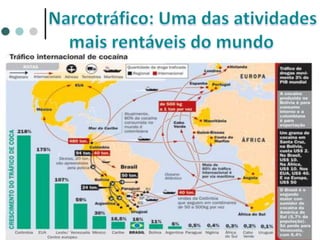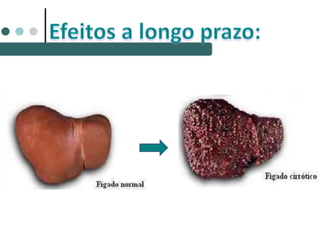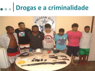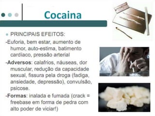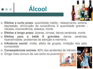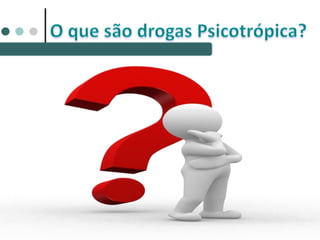 O documento discute os efeitos das drogas no corpo humano e sua classificação. Aborda como as drogas circulam no sangue e os tipos de drogas psicotrópicas, como lícitas e ilícitas. Também menciona os efeitos agudos e crônicos das drogas e condições como dependência, tolerância e abstinência.