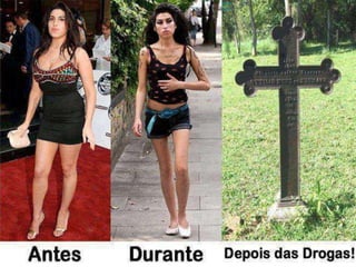 O documento discute drogas ilícitas, seus efeitos no cérebro, as principais drogas usadas, os motivos que levam os jovens a usá-las, como elas entram no país de forma ilegal, doenças causadas por drogas, tratamento para dependência e casos de pessoas que perderam tudo por causa das drogas.