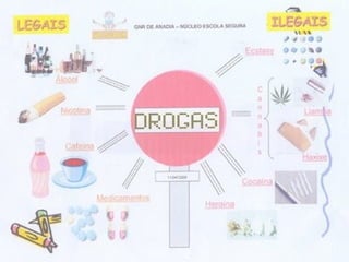 O documento aborda o tema das drogas, explicando suas definições, classificações, efeitos, motivos para uso, consequências e a realidade do consumo entre adolescentes. Destaca a importância da prevenção através da informação e do tratamento adequado para os usuários. A conclusão enfatiza o aprendizado sobre os perigos das drogas e a responsabilidade de dizer não a elas.