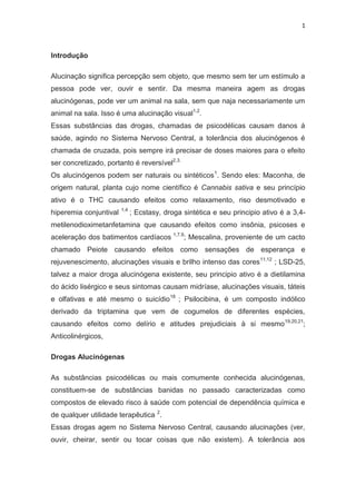 O documento discute drogas alucinógenas e sua detecção laboratorial. Ele resume que essas drogas agem no sistema nervoso central e podem causar alucinações, com tolerância que varia entre cada droga, mas é reversível. As principais drogas alucinógenas discutidas são maconha, mescalina, LSD, MDMA, DMT e psilocibina. Técnicas como GC-MS e HPLC-MS são usadas para detecção em amostras biológicas como urina, sangue e cabelo.