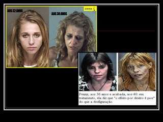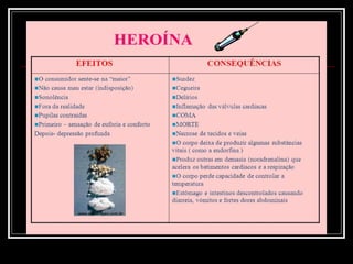 O documento discute os diferentes tipos de drogas, dividindo-as entre drogas lícitas (permitidas) e ilícitas (proibidas). Apresenta os riscos à saúde do cigarro e do álcool, incluindo vários tipos de câncer e doenças cardíacas. Também descreve brevemente alguns efeitos da maconha, cocaína e crack, além dos perigos de overdose. O texto alerta sobre os riscos das drogas e incentiva os leitores a escolherem um estilo de vida saudável e consciente