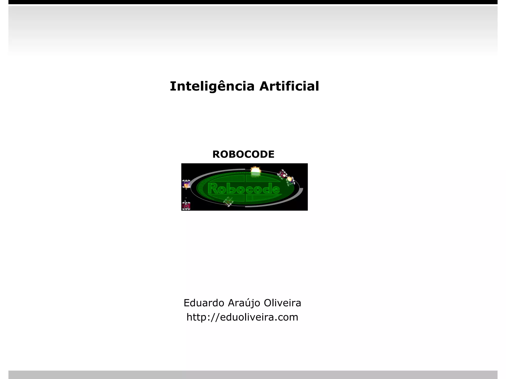 O documento descreve o Robocode, um ambiente de simulação de batalha entre robôs criados em Java. Ele explica como instalar e usar o Robocode, integrá-lo com Eclipse, e como criar robôs dentro do Eclipse. Também mostra como integrar o Robocode com o Drools para adicionar regras de decisão ao comportamento dos robôs.
