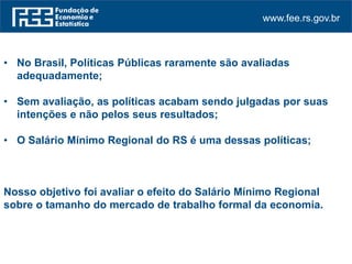 O documento avalia os efeitos do salário mínimo regional no mercado de trabalho formal do Rio Grande do Sul, concluindo que sua implementação reduz o tamanho desse mercado, especialmente quando há um diferencial maior em relação ao piso nacional. Os resultados indicam que a presença do salário mínimo gera uma descontinuidade na formalidade do emprego, sendo este efeito significativo e impactando negativamente a qualidade dos empregos, investimentos nas empresas e a arrecadação fiscal. É enfatizado que outras consequências do salário mínimo regional também precisam ser estudadas mais profundamente pelo governo.