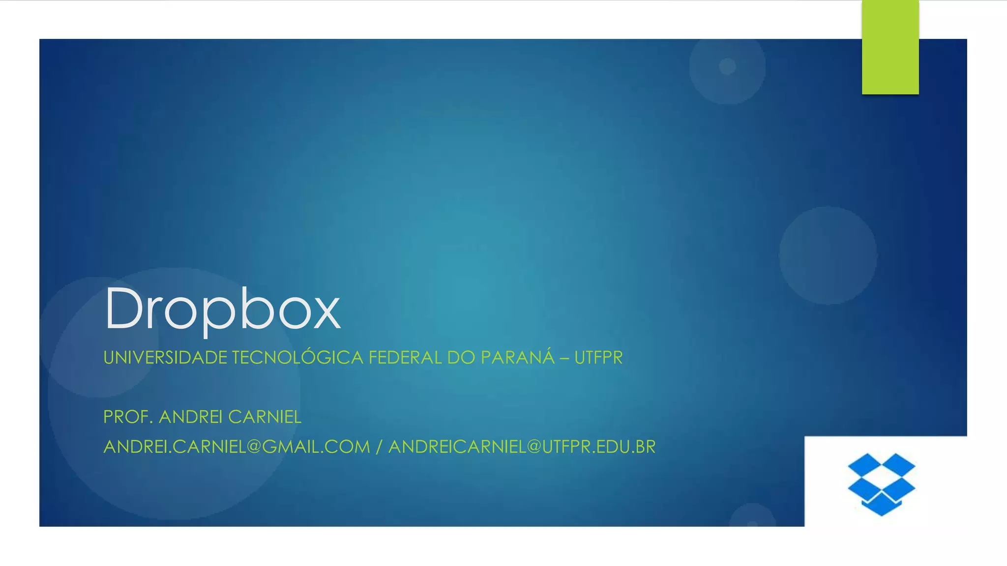 O documento fornece instruções sobre como usar o serviço de armazenamento em nuvem Dropbox. Ele explica que o Dropbox permite armazenar arquivos online e acessá-los de qualquer dispositivo, e também compartilhar arquivos. O documento guia o leitor através do processo de criação de uma conta, instalação do aplicativo, uso da pasta Dropbox e acesso online, além de compartilhamento de arquivos.