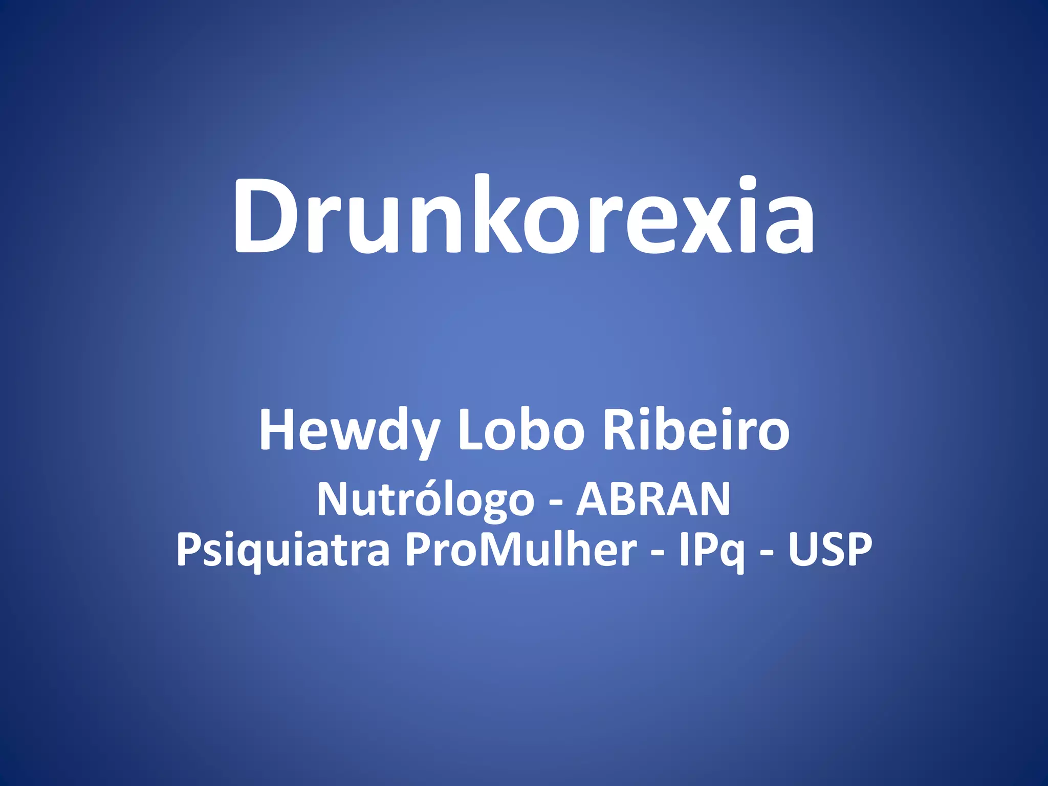 O documento discute o transtorno conhecido como "drunkorexia", que envolve o abuso de álcool por pessoas com transtornos alimentares para evitar ganho de peso. Ele explica as características do transtorno, incluindo sua definição, sintomas, causas e efeitos do álcool. O documento também fornece recomendações para o diagnóstico e tratamento da condição.