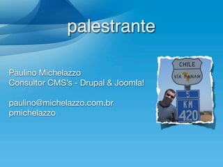 O documento apresenta novidades do Drupal 7 para administradores, desenvolvedores e designers. Para administradores, destaca melhorias na segurança, performance e atualizações com o DRUSH. Para desenvolvedores, cita novos módulos como Arquivos e Imagens, além de melhorias na documentação e testes. Para designers, comenta temas e bibliotecas jQuery atualizadas.