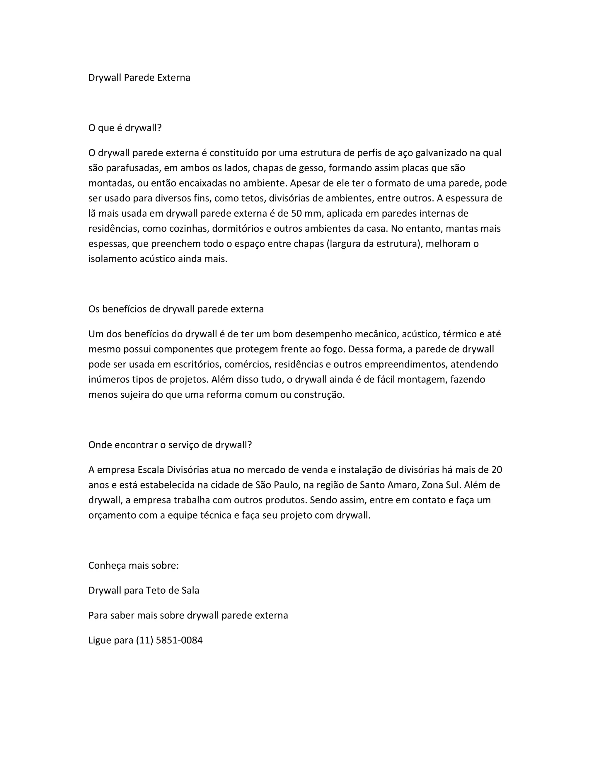 O drywall parede externa é uma estrutura composta por perfis de aço galvanizado e chapas de gesso, utilizada para diversas aplicações, incluindo paredes e tetos. Seus principais benefícios incluem bom desempenho acústico, térmico e resistência ao fogo, além de facilidade na montagem. A empresa Escala Divisórias, com mais de 20 anos de experiência, oferece serviços de venda e instalação de drywall na região de Santo Amaro, São Paulo.