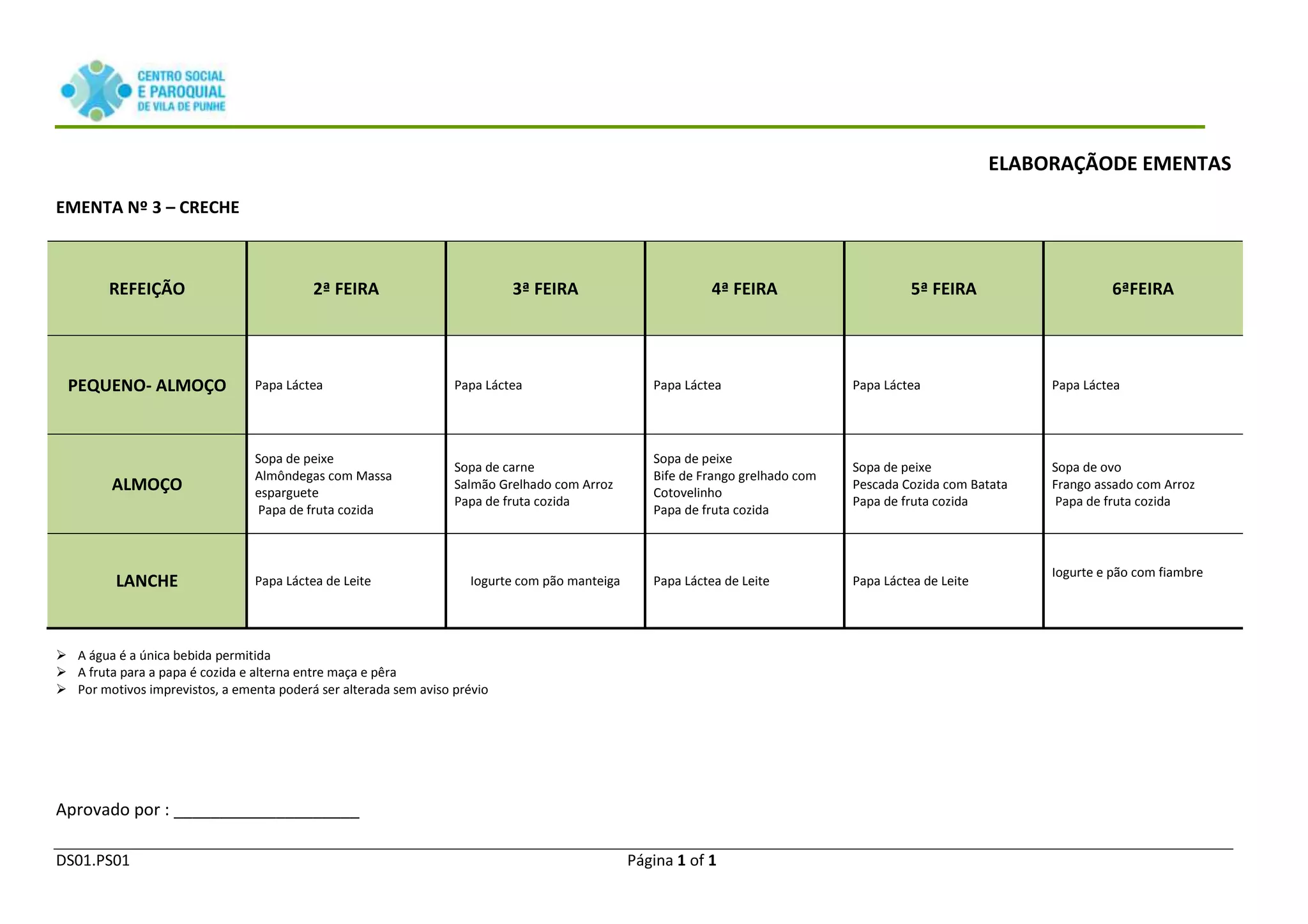 Este documento apresenta o cardápio semanal de uma creche, incluindo o pequeno-almoço, almoço e lanche das segundas às sextas-feiras. O pequeno-almoço consiste em papa láctea todos os dias. Os almoços variam entre sopas, peixe, carne e frango acompanhados de arroz ou batata, enquanto a sobremesa é sempre papa de fruta cozida. A água é a única bebida permitida e a fruta para a papa alterna entre maça e pê