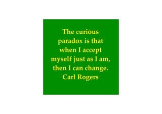 Carl Rogers propôs uma abordagem centrada na pessoa, enfatizando a importância do relacionamento terapêutico e da valorização positiva incondicional para o crescimento pessoal. Ele afirmou que a educação deve ser um processo de autoaprendizagem, onde o aluno assume a responsabilidade por sua própria educação, desconsiderando sistemas tradicionais de avaliação e ensino. A aprendizagem significativa, segundo Rogers, deve ser pessoal e autoiniciada, permitindo que os estudantes explorem suas curiosidades e se tornem indivíduos plenamente funcionais.