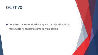 Este documento discute a importância de proteger as mãos no trabalho e na vida pessoal. Ele lista vários tipos comuns de lesões nas mãos, como cortes e fraturas, e suas consequências profissionais, sociais e pessoais. O documento também descreve vários tipos de luvas protetoras e seus usos, além de fornecer recomendações sobre primeiros socorros para diferentes tipos de lesões nas mãos.