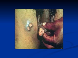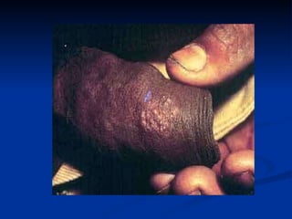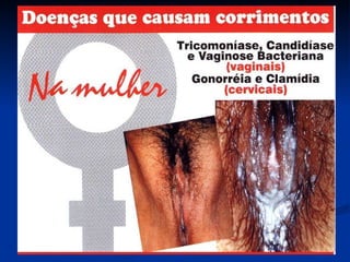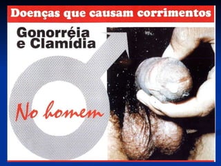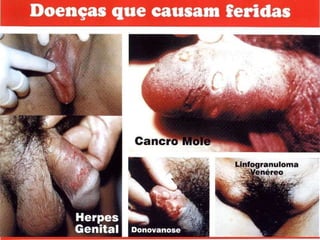O documento discute as Doenças Sexualmente Transmissíveis (DST), incluindo sintomas, formas de transmissão e tratamento. As principais DST abordadas são herpes genital, cancro mole, granuloma inguinal e gonorréia. O documento enfatiza a importância do diagnóstico precoce e do uso de preservativos para prevenção.