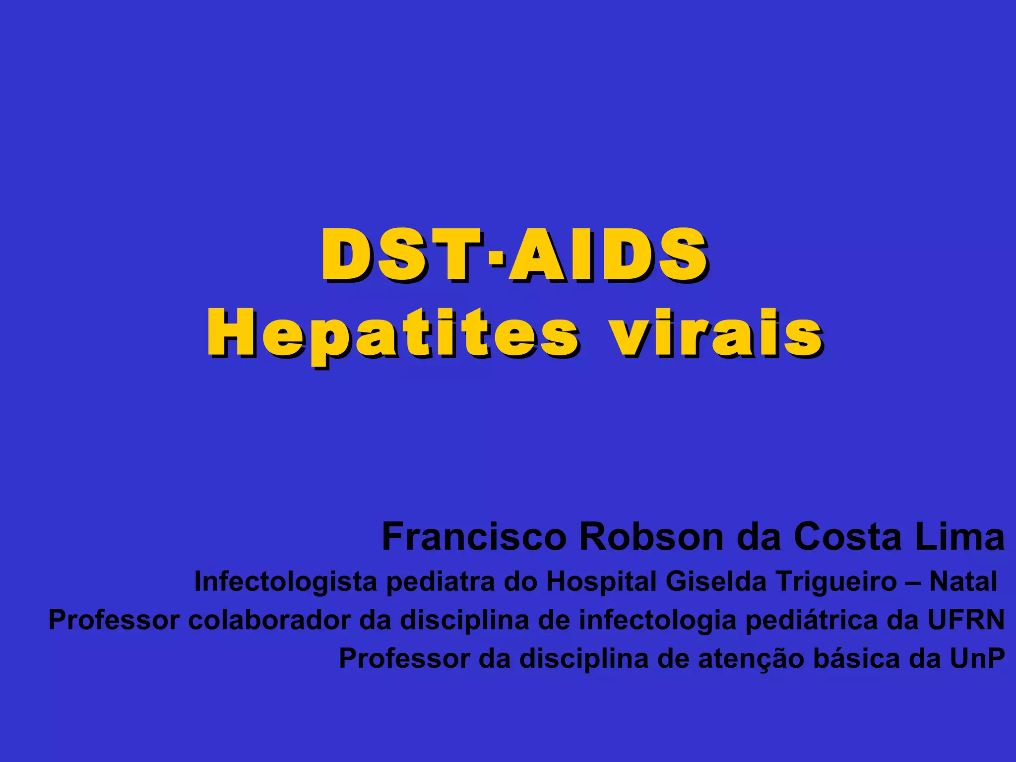 Francisco Robson daCosta Lima Infectologista pediatra do Hospital Giselda Trigueiro – Natal Professor colaborador da disciplina de infectologia pediátrica da UFRN Professor da disciplina de atenção básica da UnP DST ∙ AIDS Hepatites virais