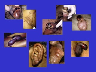 QUADRO CLÍNICO -Inicia-se: ulceração de borda plana ou hipertrófica bem delimitada, fundo granuloso, vermelho, fácil sangramento - ulceração evolui lenta e progressiva: VEGETANTE ou úlcero-vegetante - predileção: dobras e perianal - não há adenite - mulher: obstrução linfática elefantíase GRANULOMA INGUINAL (DONOVANOSE)