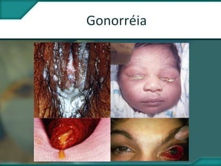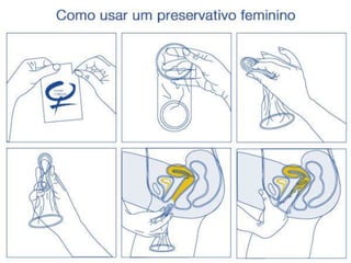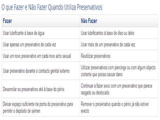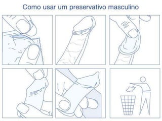 O documento discute doenças sexualmente transmissíveis (DSTs), incluindo tipos como HIV/AIDS, clamídia e gonorréia. Ele explica como essas doenças são transmitidas e sintomas comuns. A prevenção dessas doenças é feita principalmente através do uso correto de preservativos durante relações sexuais.
