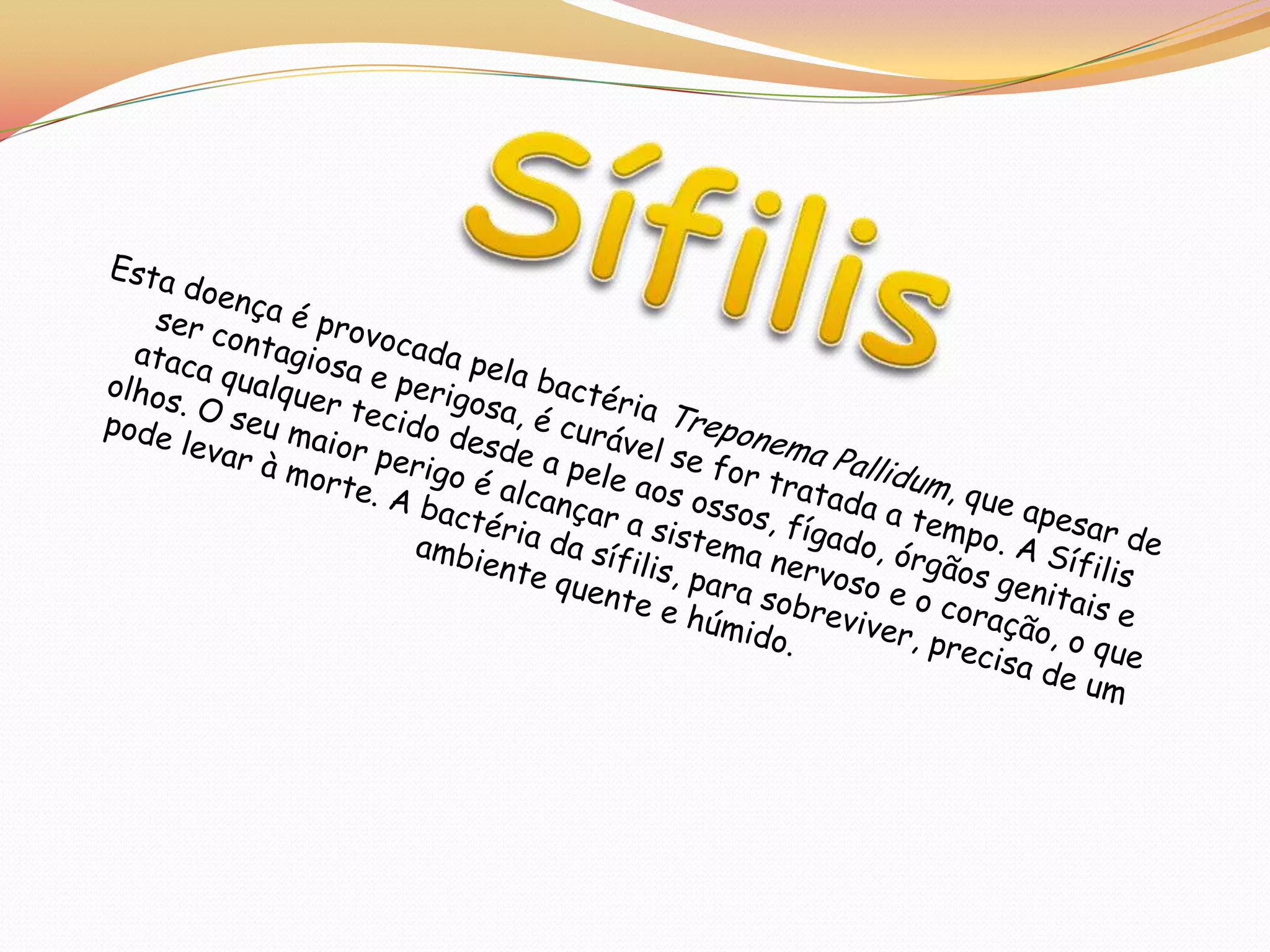 Este documento discute várias doenças sexualmente transmissíveis, incluindo a sífilis, causada pela bactéria Treponema Pallidum, que pode ser curada com tratamento precoce, mas pode danificar vários tecidos e órgãos se não tratada. Também discute a AIDS, causada pelo vírus HIV, que destrói o sistema imunitário, e a hepatite B, causada por um vírus que ataca o fígado.