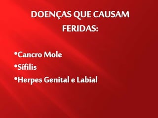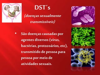 DSTs são doenças sexualmente transmissíveis causadas por vários agentes e transmitidas por relações sexuais. O HPV pode causar verrugas genitais e representar riscos para a gestante, enquanto a sífilis é causada por uma bactéria e pode afetar qualquer órgão se não tratada. O HIV, vírus da AIDS, enfraquece o sistema imunológico e deixa o corpo vulnerável a outras doenças.