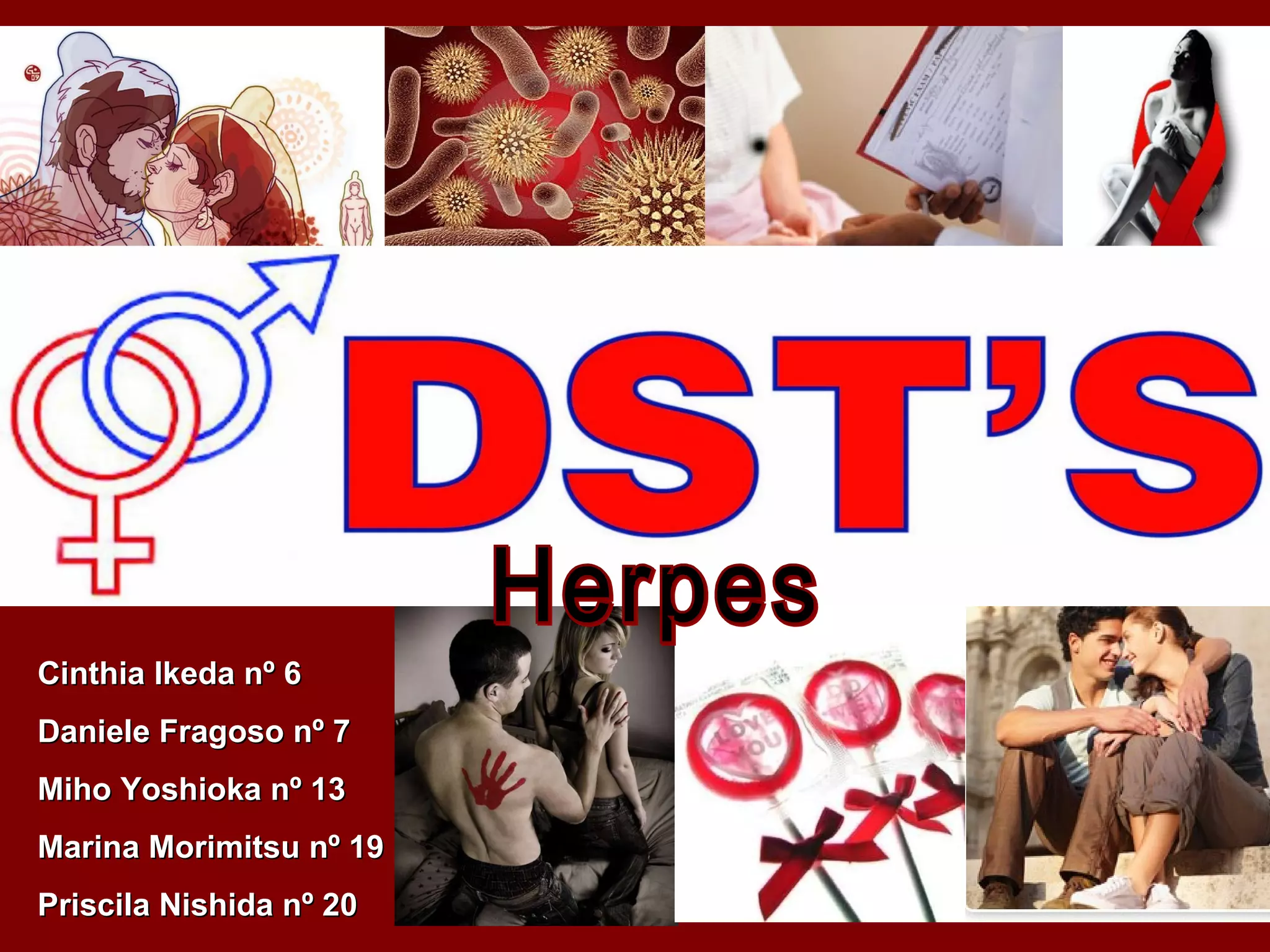 O documento descreve o vírus herpes simples, causador de herpes labial e genital. O vírus pode causar lesões na boca ou genitais e fica latente no corpo, podendo ser reativado por estresse ou queda na imunidade. O documento fornece detalhes sobre sintomas, tratamento, prevenção e epidemiologia da doença.