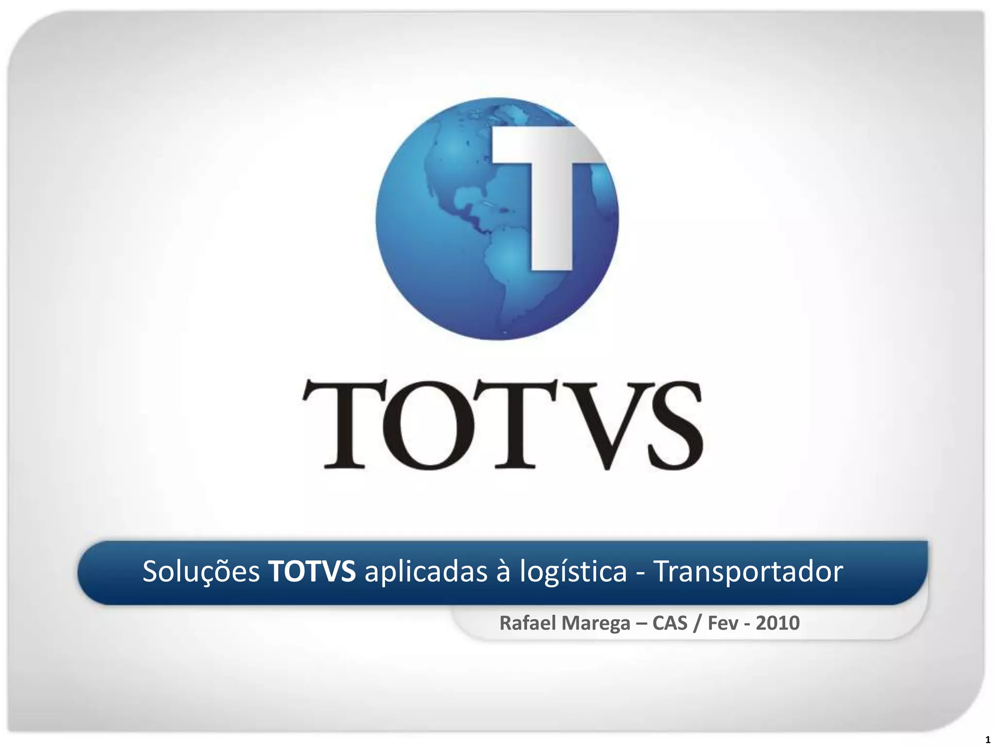 [1] O documento discute soluções da TOTVS aplicadas à logística de transportadoras, incluindo o TMS (Transportation Management System) e como ele pode ajudar a controlar custos e melhorar a produtividade.