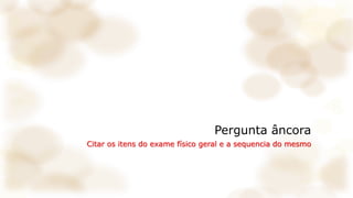 O documento descreve os itens do exame físico geral e sua sequência, incluindo: estado geral, nível de consciência, postura e sinais de desconforto, facies, hidratação. Perguntas são feitas sobre o significado de "estado geral", níveis de consciência, e possíveis indicações da postura do paciente no leito. Definições de diferentes tipos de facies (hipocrática, leonina, esclerodérmica, mongoloide e miastênica) também são fornecidas.