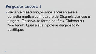 O documento discute um caso clínico de um paciente masculino de 54 anos com dispneia, cianose e tiragem. A hipótese diagnóstica é de DPOC por asma/bronquite crônica devido ao tórax em formato de barril. O ritmo respiratório de Kussmaul ocorre em casos graves de acidose metabólica e se caracteriza por apneias inspiratórias e expiratórias alternadas. A síndrome da veia cava superior é a causa mais comum de circulação colateral no tórax.