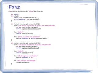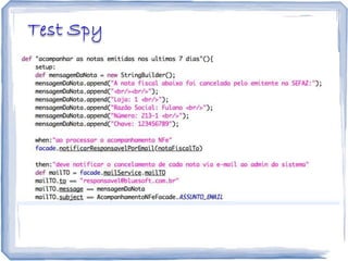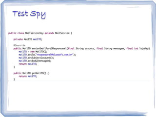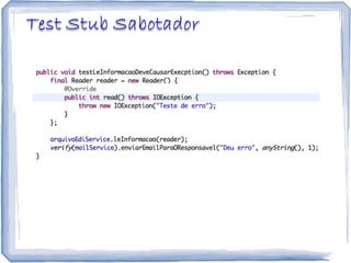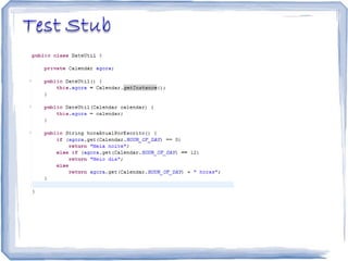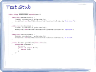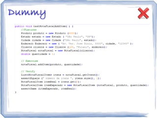 O documento discute a utilização de dublês em testes de unidade, diferenciando entre mocks e stubs conforme explicado por Martin Fowler. Ele oferece exemplos de testes utilizando esses conceitos e sugere estratégias para determinar quando usar cada um, além de mencionar ferramentas disponíveis para a criação de dublês. O texto também ressalta as vantagens do uso de dublês, como a isolação de testes e a prevenção de efeitos colaterais.