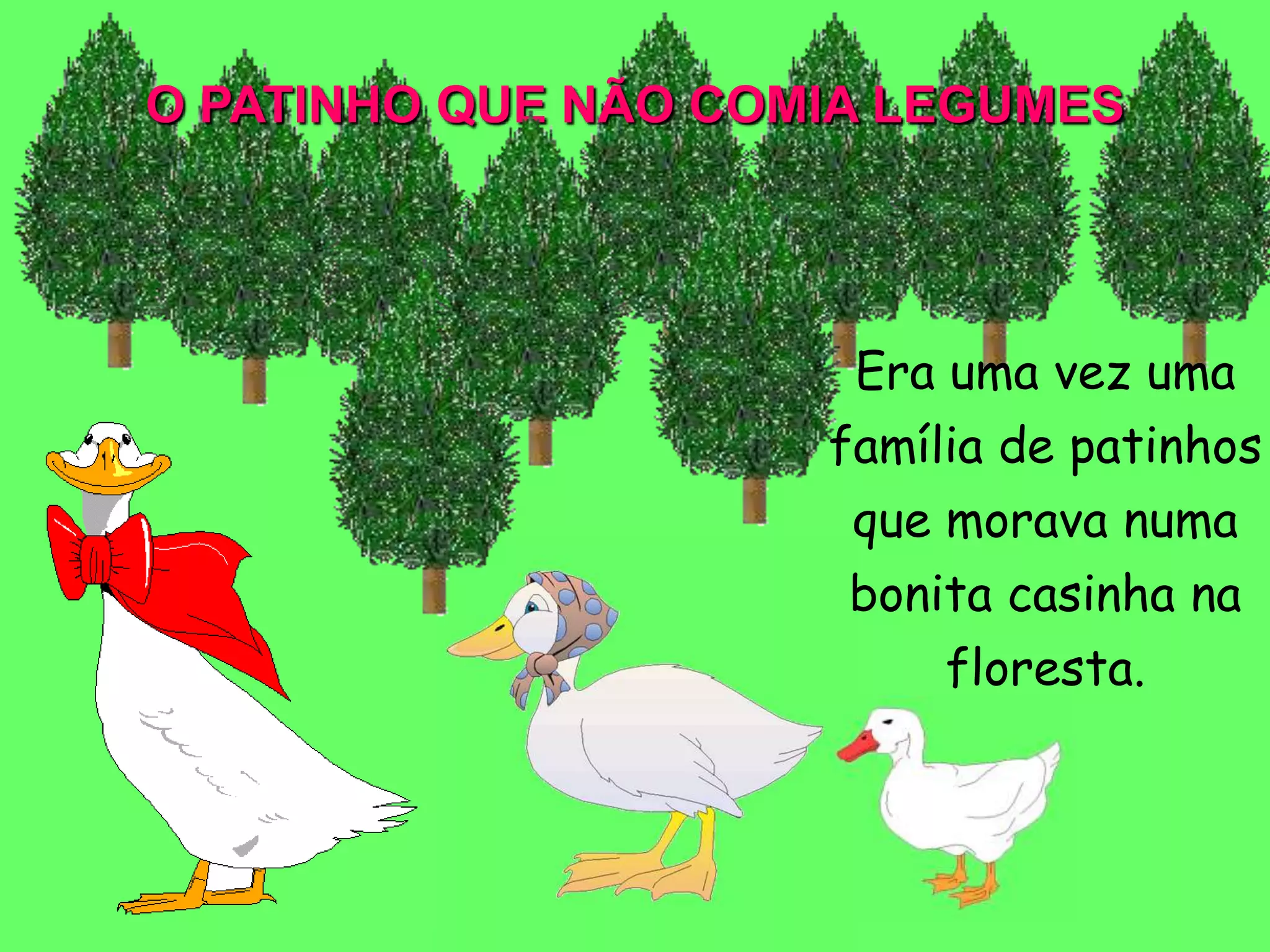 O Sr. Pato cultivava uma horta com diversos legumes. Seu filho Artur não gostava de comer legumes e inventava desculpas. Certo dia, ao regar a horta, Artur ouviu gemidos vindos dos legumes e descobriu que eram duendes morando neles, que o alertaram sobre a importância dos nutrientes dos legumes para a saúde. A partir daí, Artur passou a comer legumes.