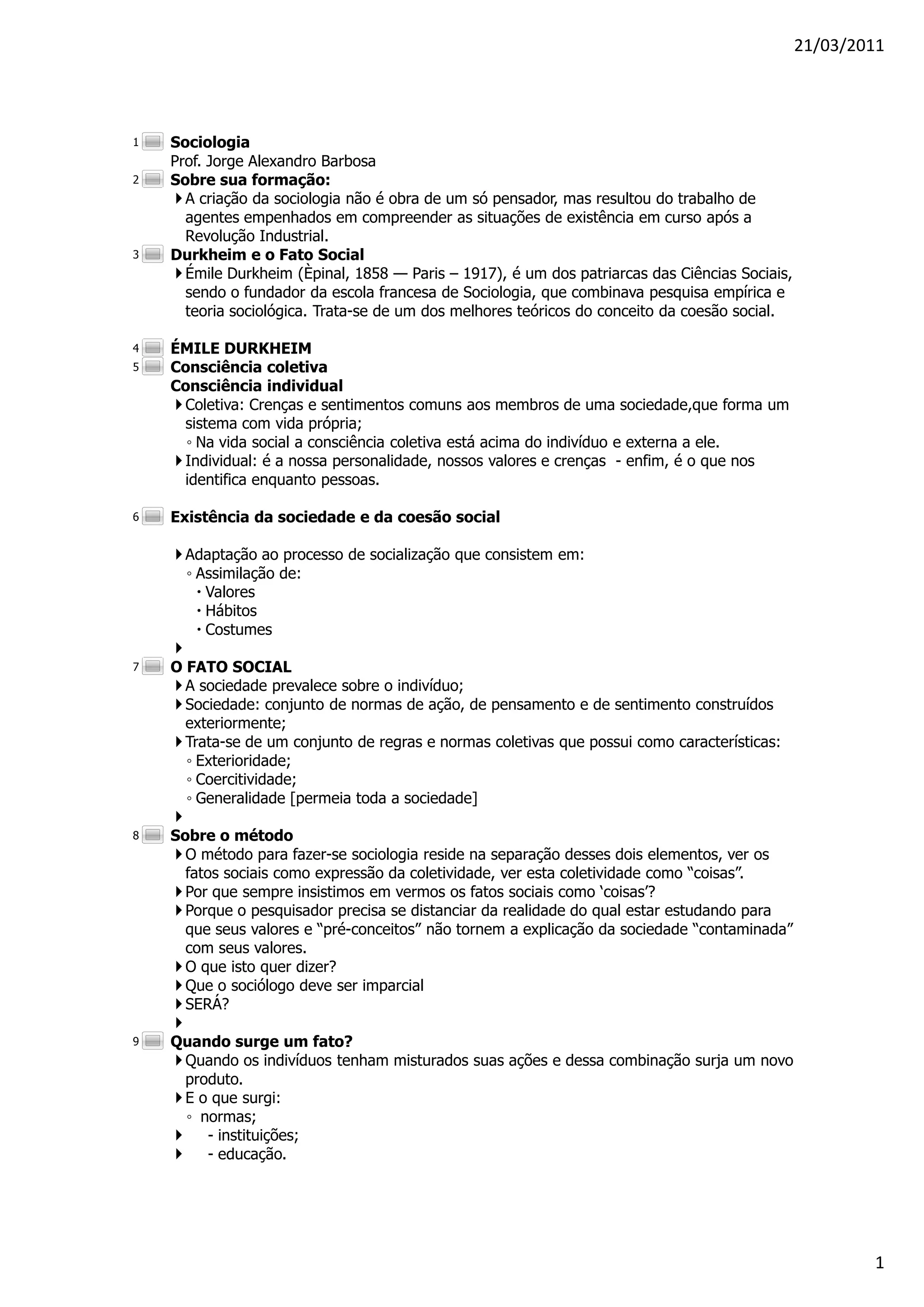 O documento discute os conceitos-chave da sociologia de Émile Durkheim e Max Weber. Durkheim propôs que a sociedade existe através da coesão social e da adaptação dos indivíduos à socialização. Ele também distinguiu entre solidariedade mecânica e orgânica. Weber analisou a ação social e como ela é determinada por tradição, emoção ou racionalidade. Ele definiu o Estado como detentor do monopólio legítimo do uso da força.