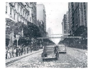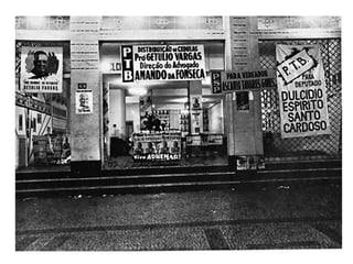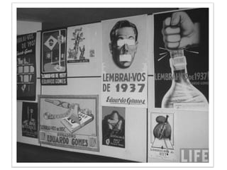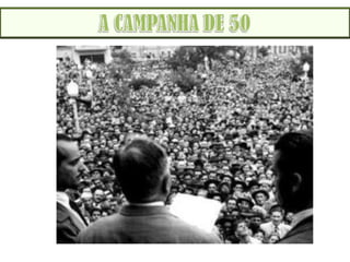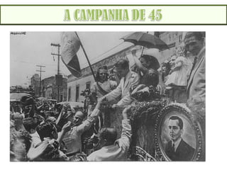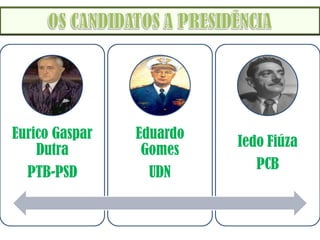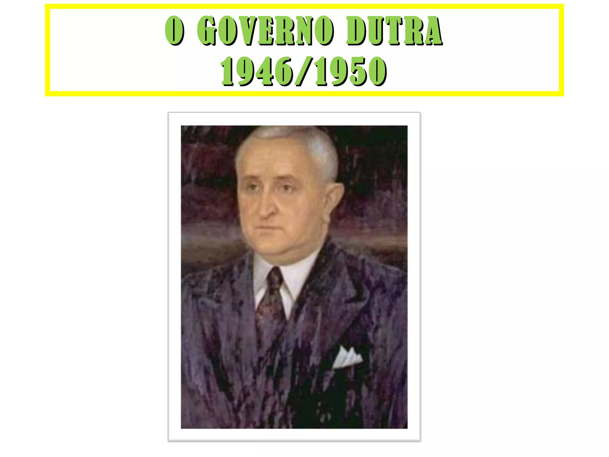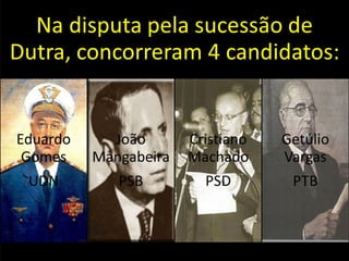 O documento descreve o período do governo de Eurico Gaspar Dutra (1946-1951) no Brasil, que sucedeu Getúlio Vargas. Dutra adotou políticas econômicas liberais e alinhou o país aos Estados Unidos na Guerra Fria, rompendo relações com a União Soviética. No entanto, sua gestão esgotou as reservas cambiais do país e causou insatisfação popular, abrindo caminho para o retorno de Vargas nas eleições de 1950.