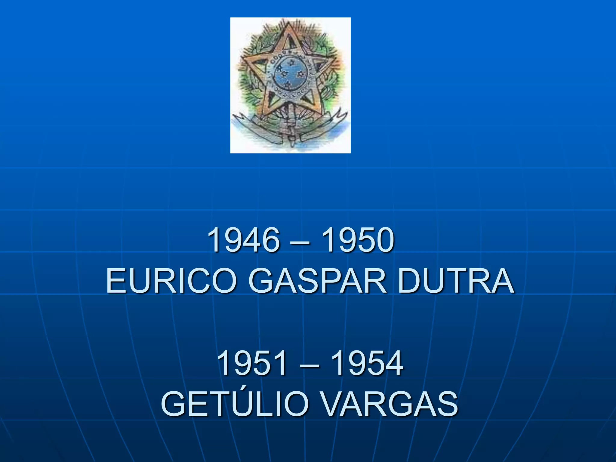 Eurico Dutra foi presidente de 1946 a 1950, continuando as políticas do Estado Novo de Vargas. Getúlio Vargas foi eleito novamente presidente em 1951, mas renunciou sob pressão em 1954, cometendo suicídio em seguida. Seu governo enfrentou oposição crescente de militares, a UDN e outros grupos.