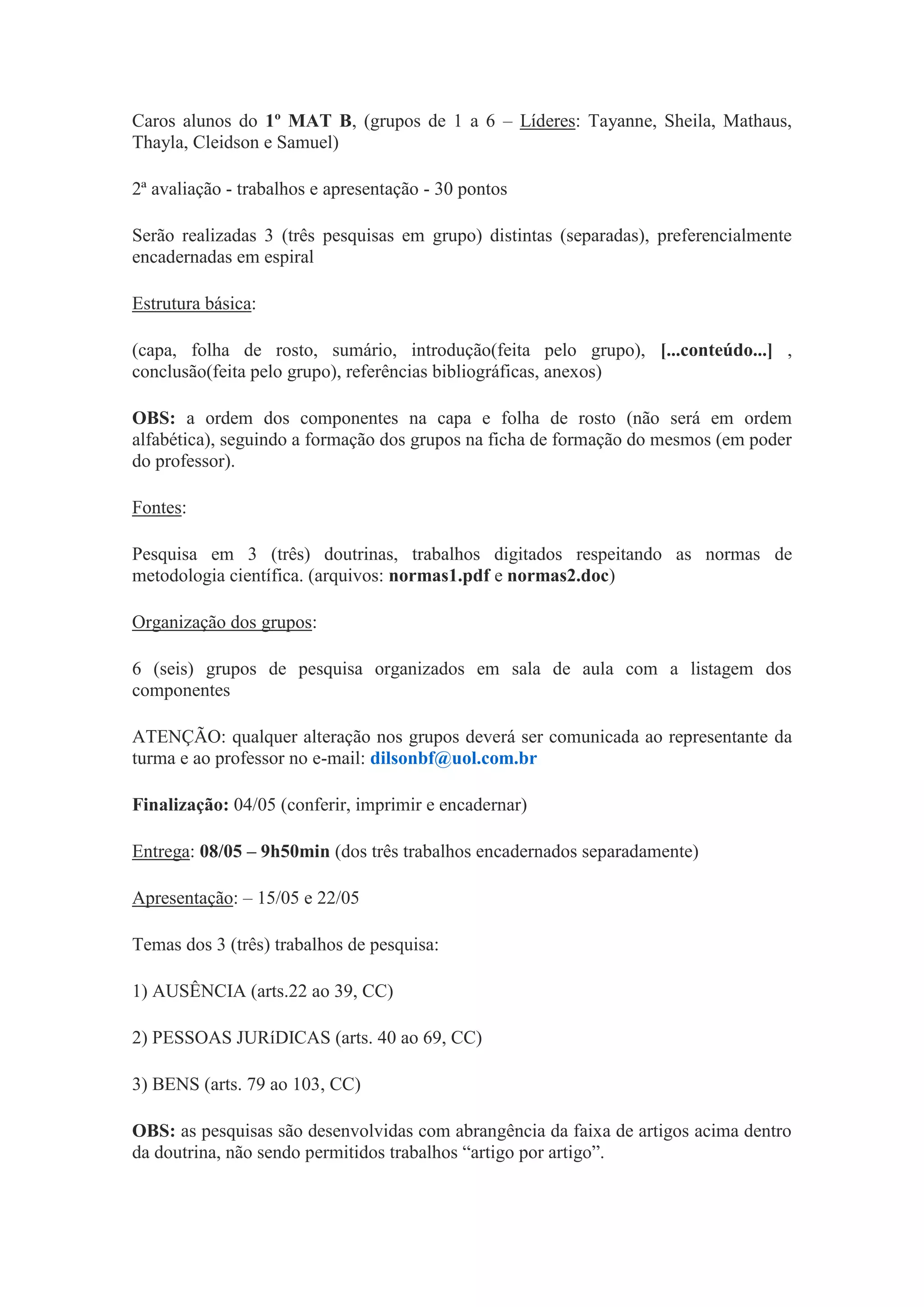 O documento informa sobre a segunda avaliação dos alunos do 1o MAT B, que consistirá em três pesquisas em grupo sobre Ausência, Pessoas Jurídicas e Bens. Cada pesquisa deve seguir uma estrutura básica e citar fontes respeitando normas de metodologia científica. Os alunos estão organizados em seis grupos e devem finalizar as pesquisas até 4 de maio, entregando-as no dia 8 e apresentando-as nos dias 15 e 22.