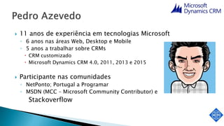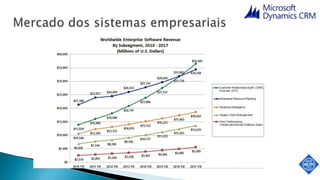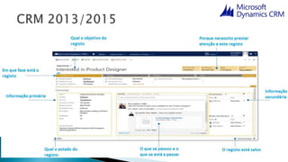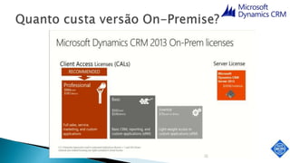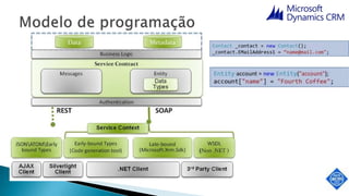 O documento discute sistemas de CRM e Microsoft Dynamics CRM, incluindo sua arquitetura, integrações, custos e evolução. Ele fornece detalhes sobre a experiência da empresa com tecnologias Microsoft e CRM, além de resumir os principais recursos e vantagens do Dynamics CRM.