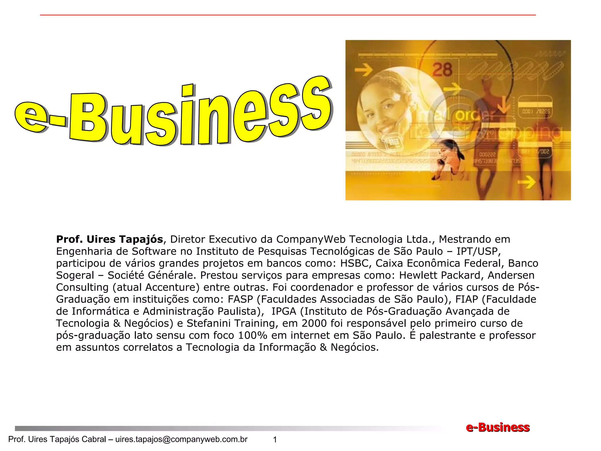 O documento descreve o perfil profissional de Uires Tapajós, diretor da CompanyWeb Tecnologia. Ele tem experiência em grandes projetos bancários e prestou serviços para empresas como HP e Accenture. Também foi professor em diversas instituições de ensino superior.