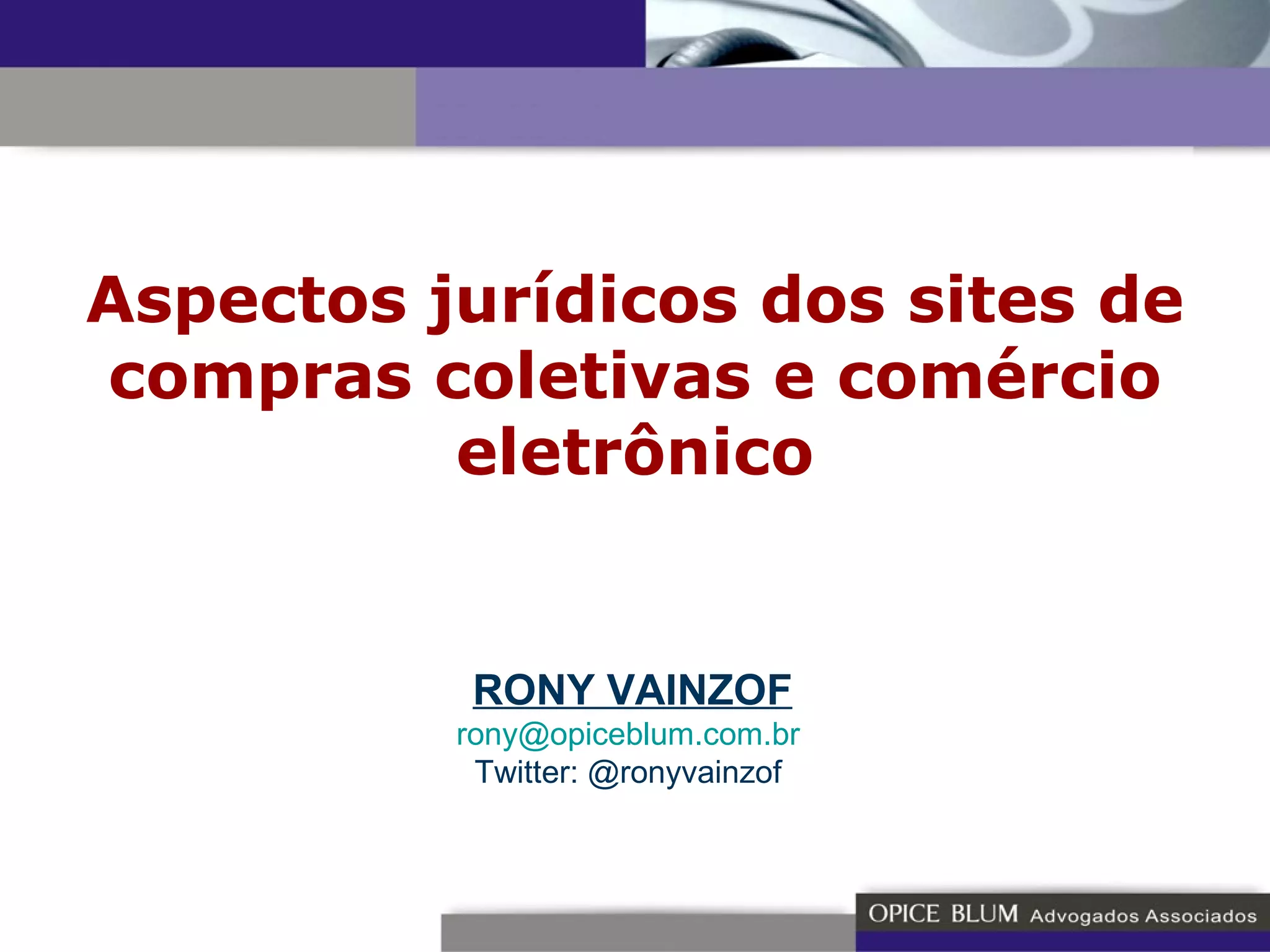 O documento discute aspectos jurídicos relacionados a sites de compras coletivas e comércio eletrônico, mencionando: 1) Definição de contrato segundo o Código Civil brasileiro e seus princípios; 2) Responsabilidade dos sites em casos de preços irrisórios, defeitos nos produtos e falhas na prestação dos serviços; 3) Decisões judiciais que analisaram casos relacionados a fraudes e descumprimento de promoções em compras online.