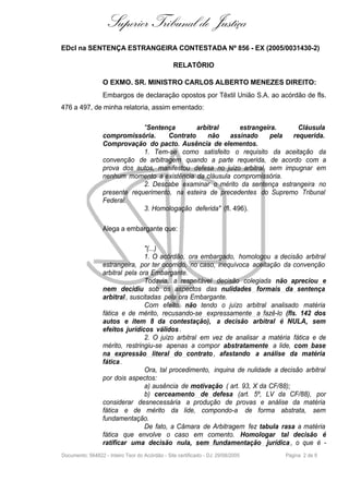 O documento é um acórdão do Superior Tribunal de Justiça do Brasil sobre embargos de declaração apresentados contra uma decisão anterior que havia homologado uma sentença arbitral estrangeira. Em três frases, o acórdão rejeita os embargos, afirmando que a decisão anterior estava suficientemente fundamentada e não continha qualquer omissão.