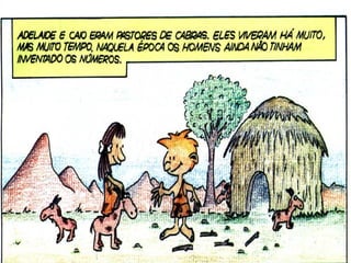 mostra como Caio e Adelaide, dois pastores de cabras, elaboraram uma estratégia para ter o controle da quantidade de cabras que possuíam. Seu rebanho vai crescendo e eles vão aperfeiçoando sua técnica... Mas tarde, fazem algumas adaptações para poderem contar quantos dias levava para a lua ficar cheia de novo, ou seja, eles começaram a se interessar pelo ciclo da Lua. E assim trabalham com a construção do Sistema Numérico Decimal (SND), em formato de quadrinhos (com uma linguagem simples e ilustrações enriquecedoras), uma excelente leitura para todos os estudantes e, principalmente, para aqueles que ainda têm dificuldade em realizar operações ou escrever algarismos, dificuldade esta, muitas vezes advinda da deficiência do conceito do número e entendimento do SND.