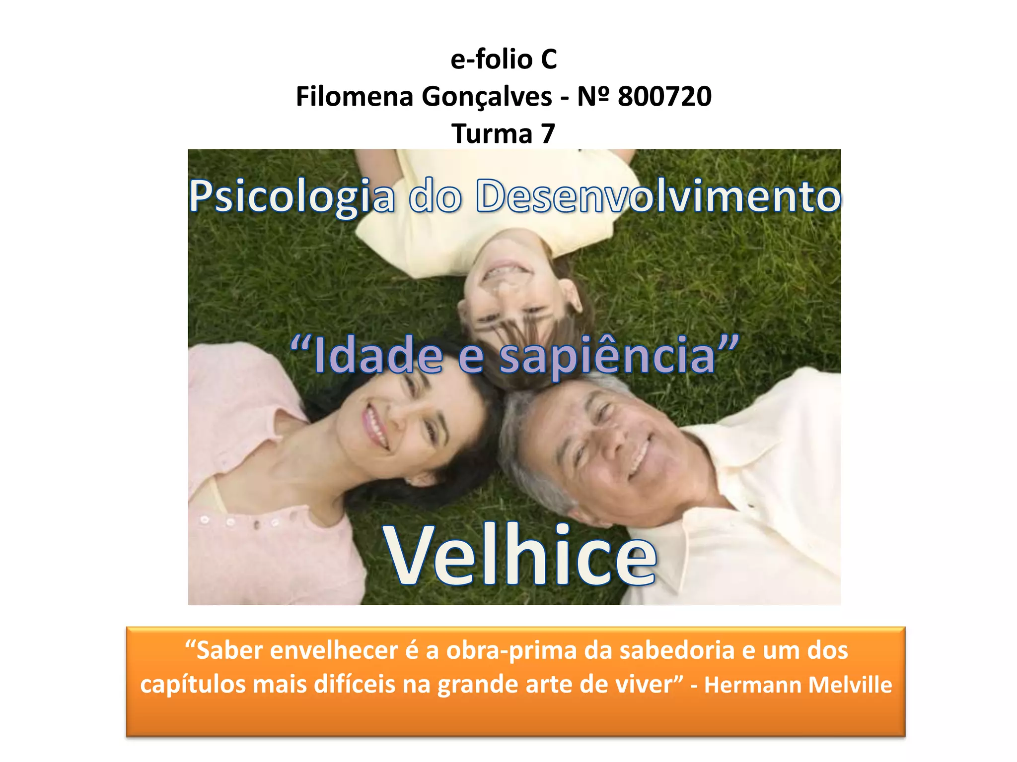 O documento discute teorias sobre o envelhecimento, incluindo teorias ambientais e programadas, bem como mitos comuns. Também aborda as principais mudanças associadas ao envelhecimento de acordo com o modelo de Baltes sobre otimização seletiva e compensação. Defende uma atitude pró-ativa na velhice, onde os idosos podem encontrar crescimento pessoal e desenvolver sabedoria através de novas experiências.